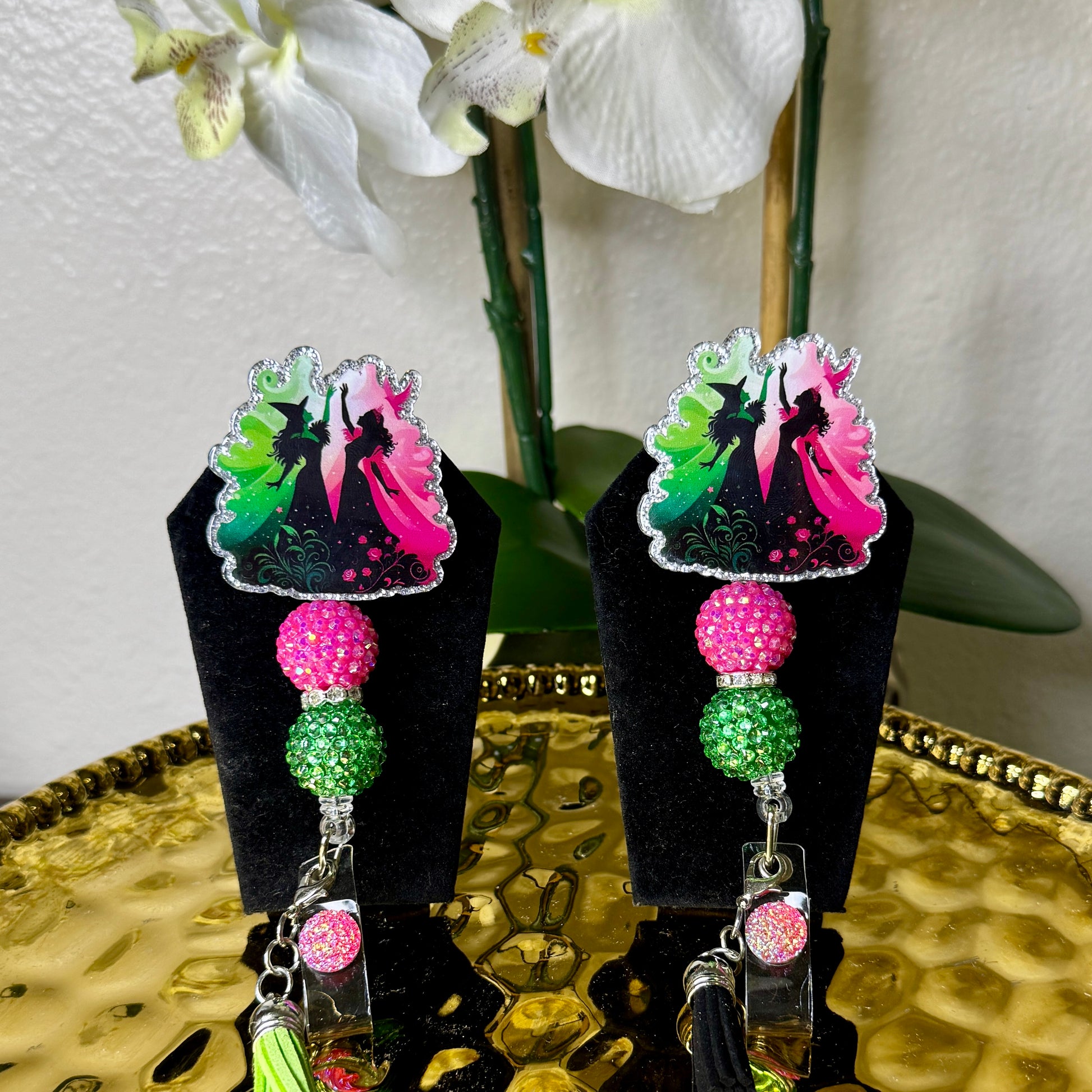 Elphaba and Glenda featured on a retractable badge reel. Please note, bead patterns vary!